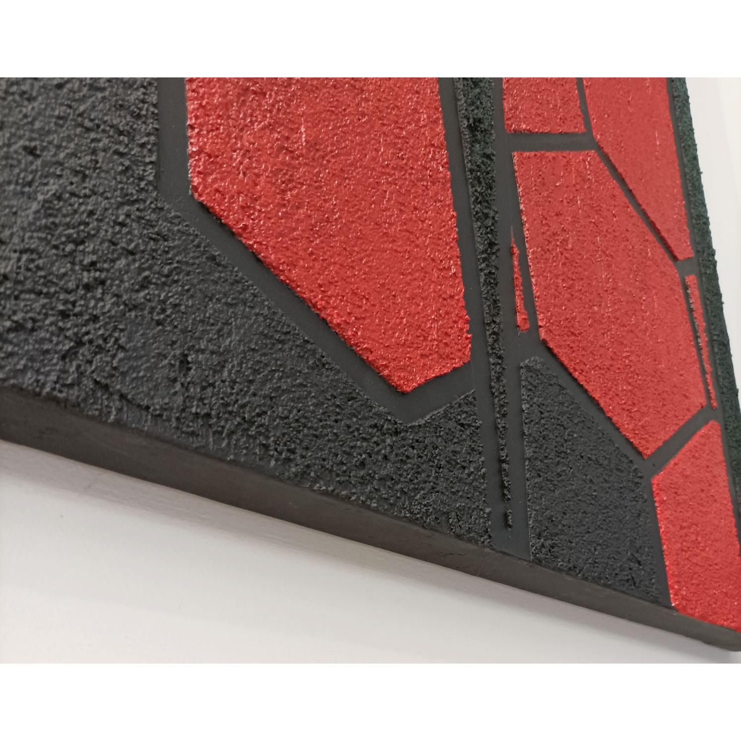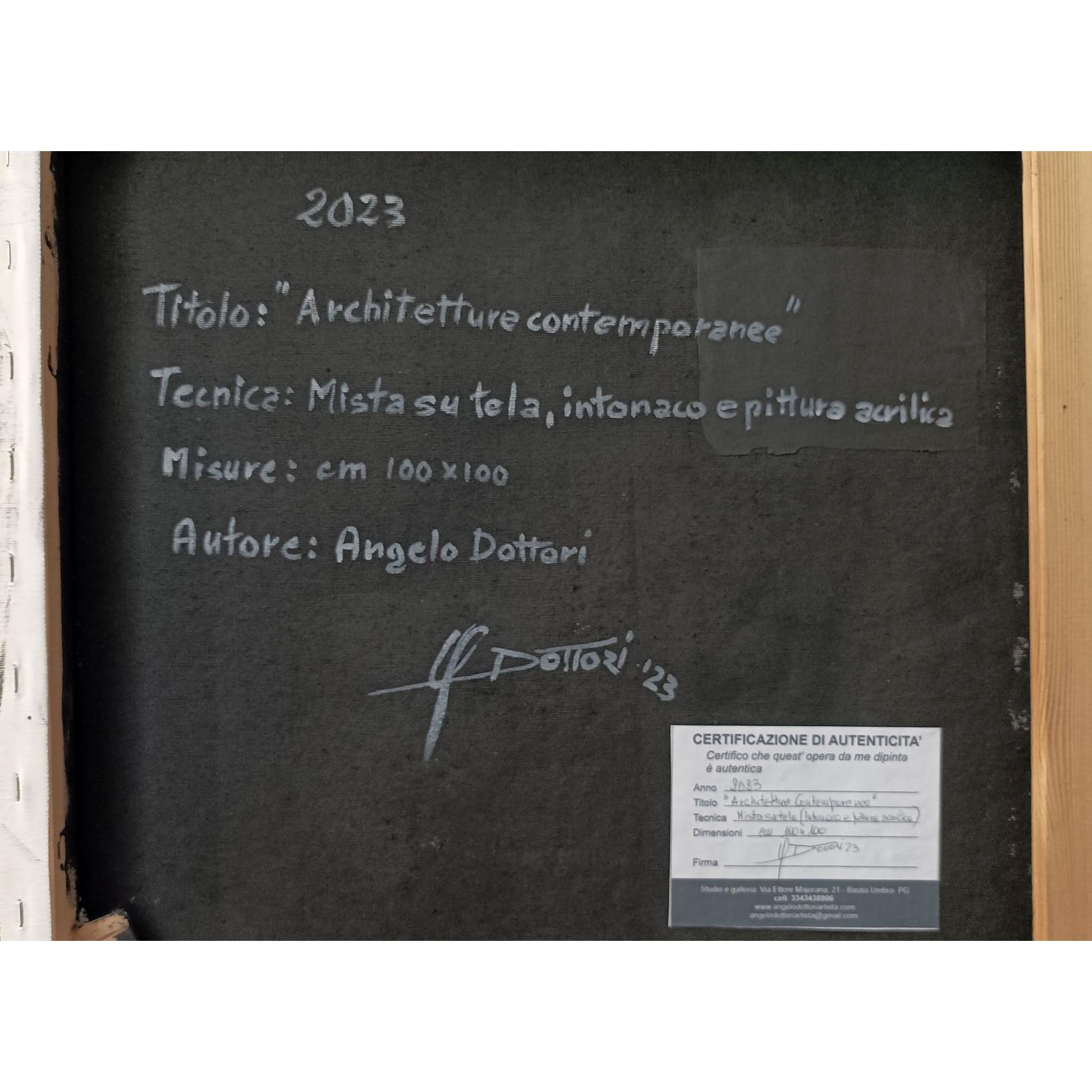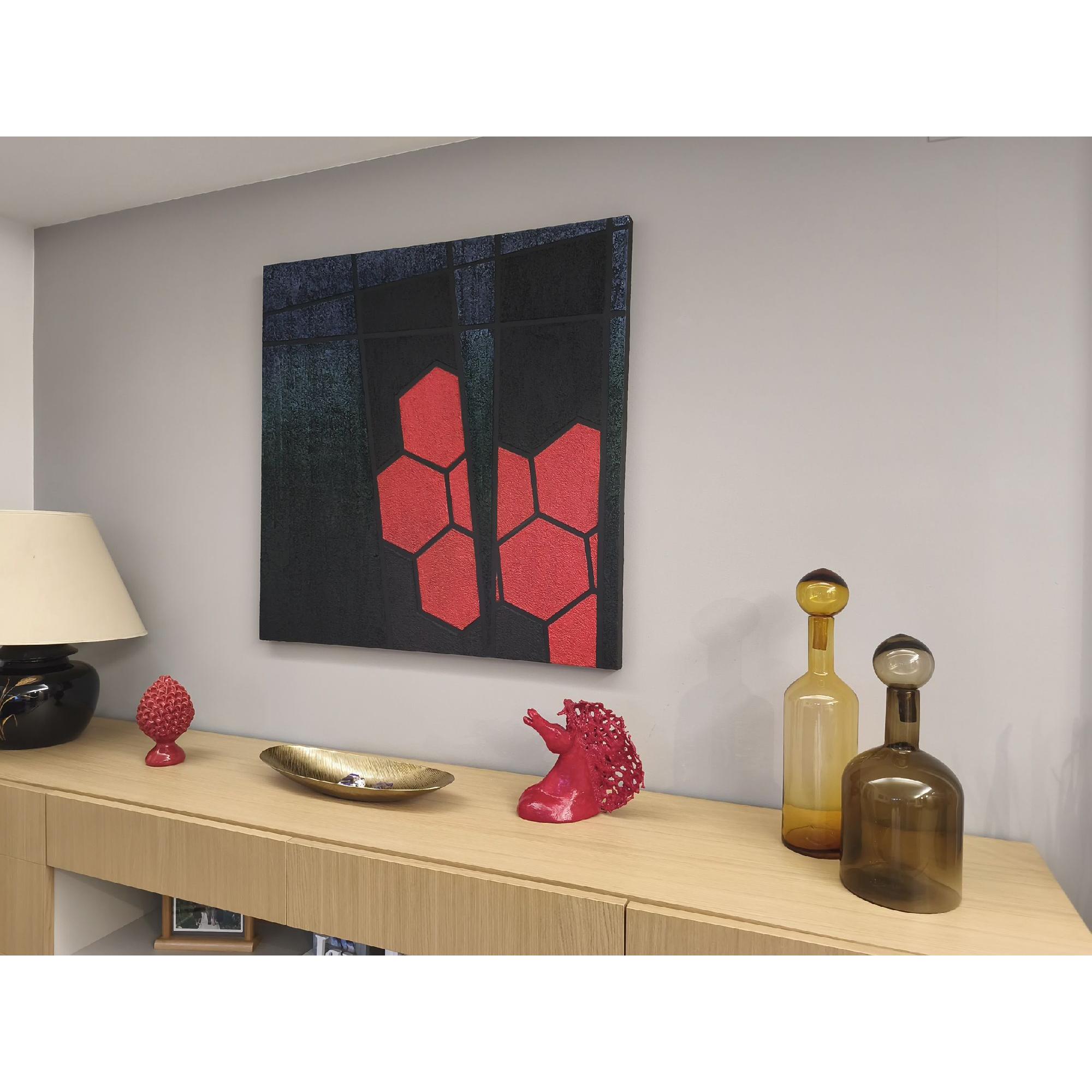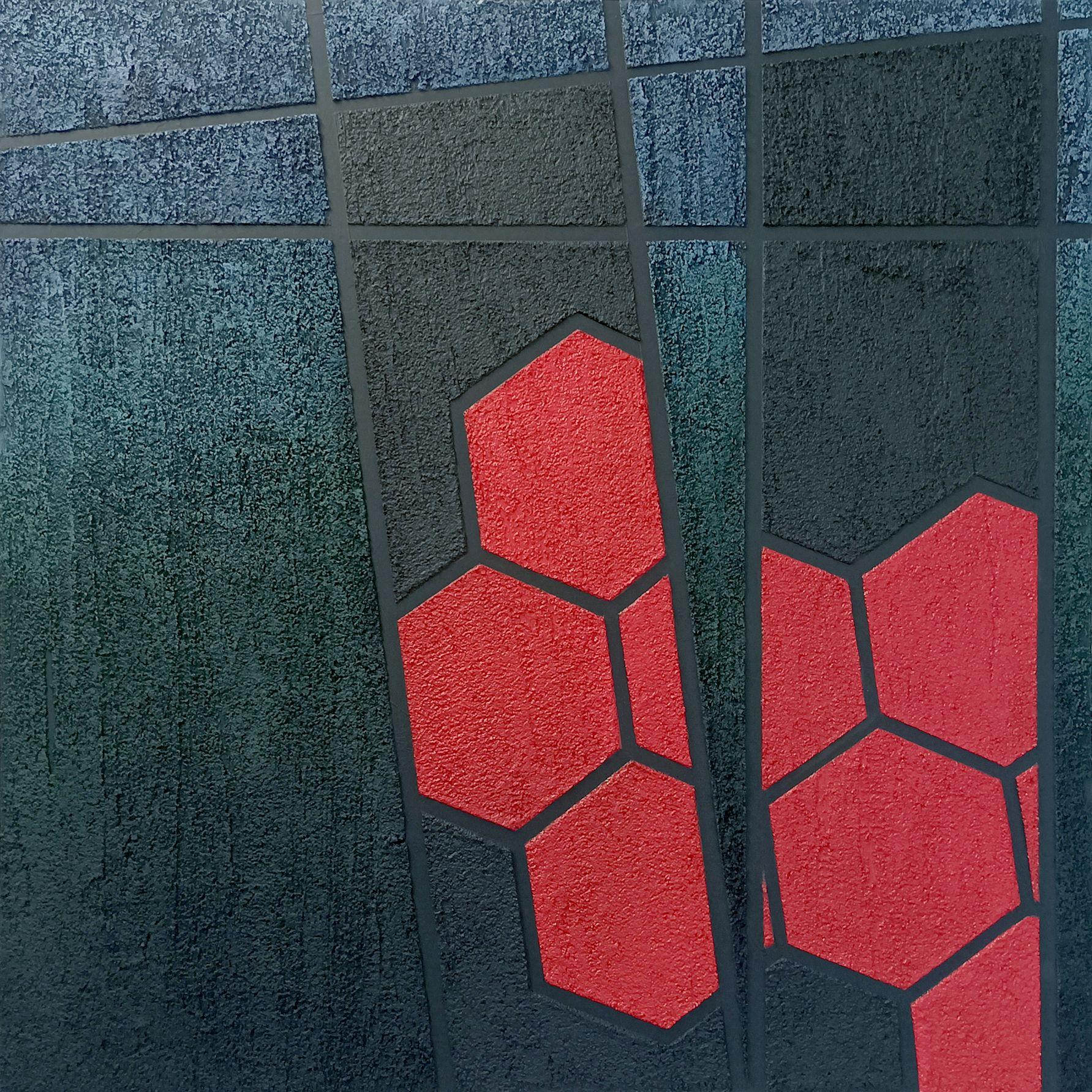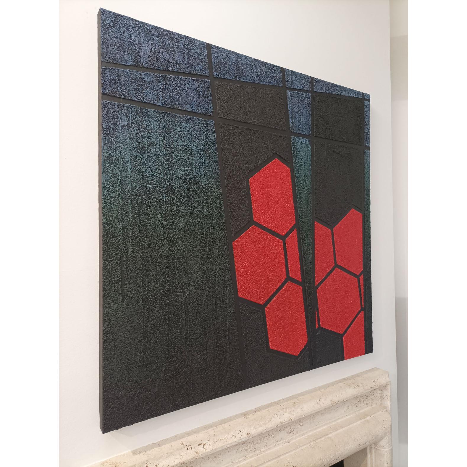 Opera che richiama l'astrattismo geometrico olandese e russo dei primi anni del '900, ispirata al paesaggio urbano che rappresenta in maniera stilizzata due grattaceli, alveari dentro i quali la vita scorre anonimamente, senza rapporti sociali o amicali. Il colore rosso, molto utilizzato dall'artista, enfatizza il messaggio. Le velature di colore sulla base materica nera, danno equilibrio al quadro.
